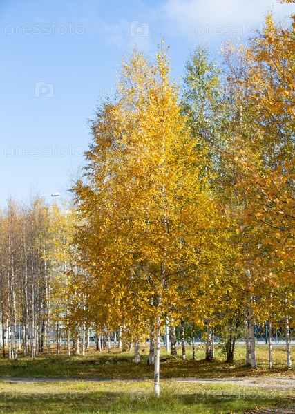 Осенняя береза с желтыми листьями в центре Ноябрьского Ямала
