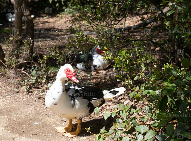 Утки на берегу пруда в парке среди деревьев в Крыму