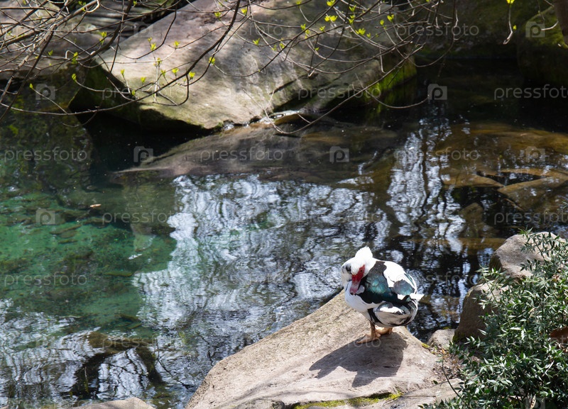 Утка в небольшом пруду среди скал весной