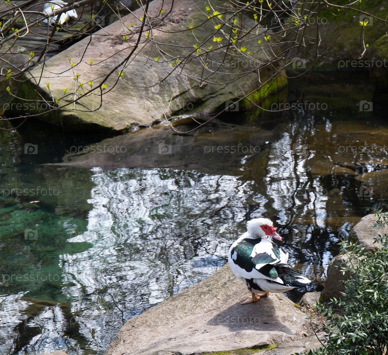 Утка в небольшом пруду среди скал весной