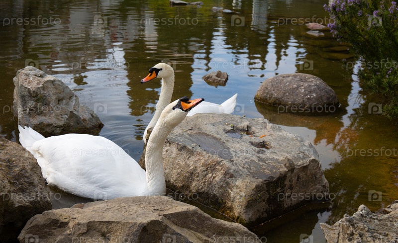 Белый лебедь в небольшом пруду среди скал