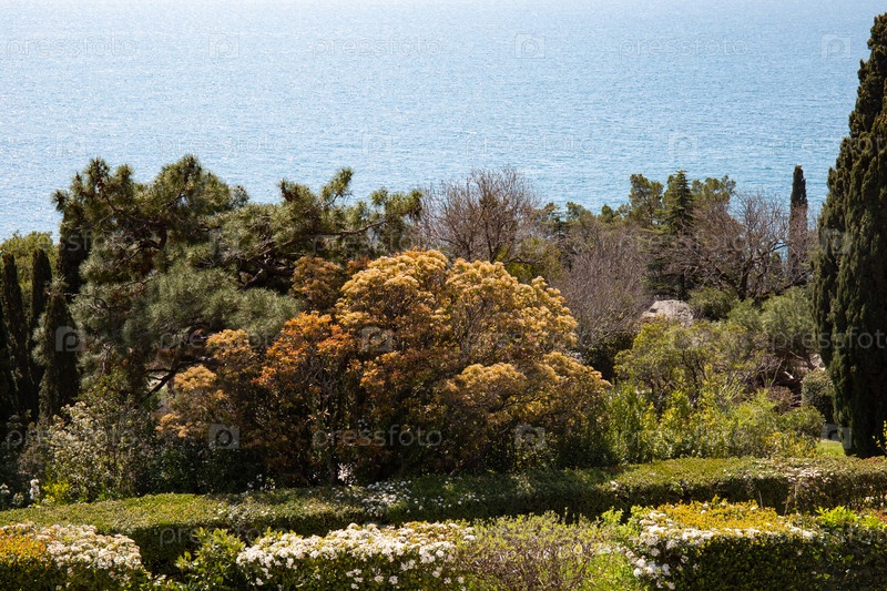 Вид на деревья на фоне Черного моря из Воронцовского замка Крым