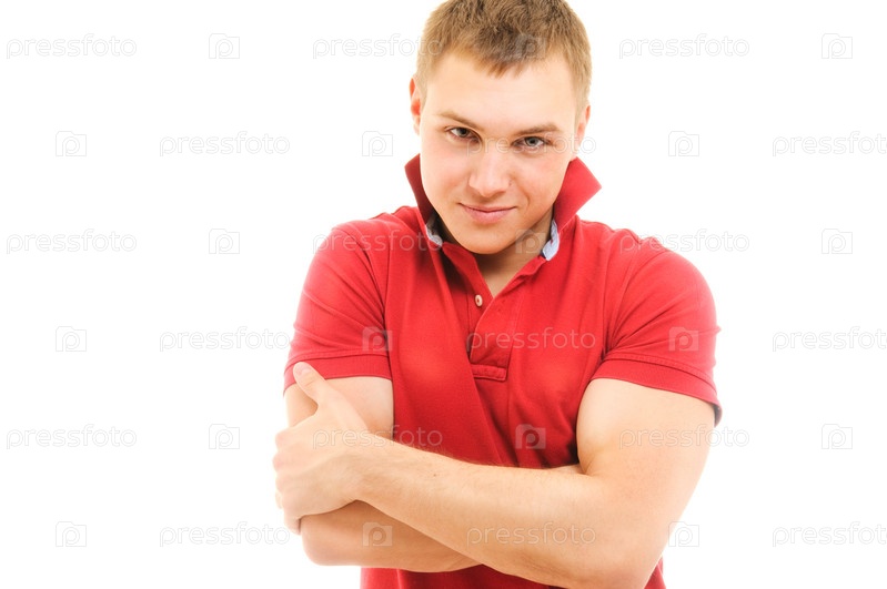 Молодой человек в красной футболке на белом фоне