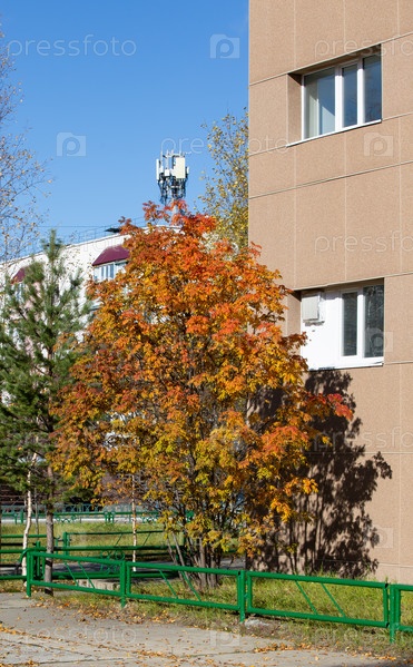 Осенняя береза с желтыми листьями в центре Ноябрьского Ямала