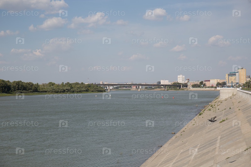 Россия Сибирь Омск Вид на город с набережной реки Иртыш летом