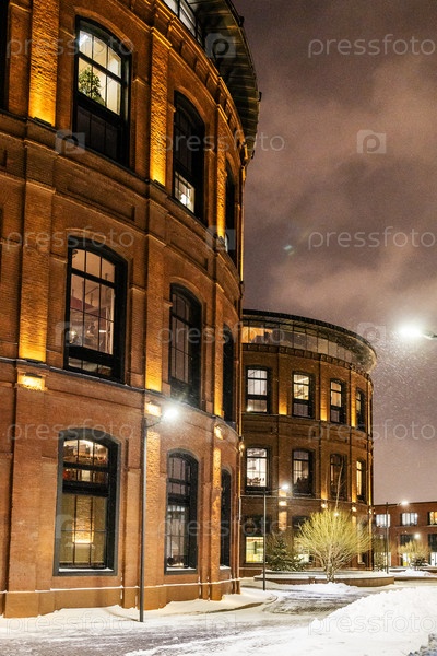 Фабричные здания после ремонта снежной ночью