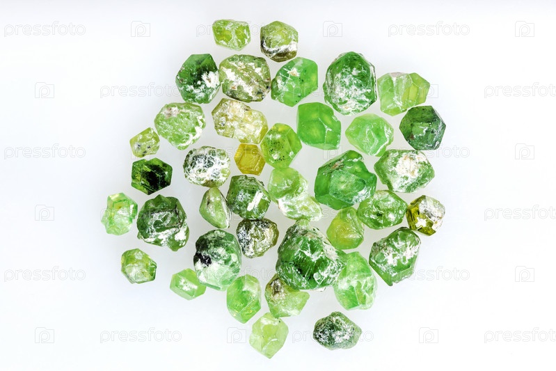 Много неполированных кристаллов демантоида на белом