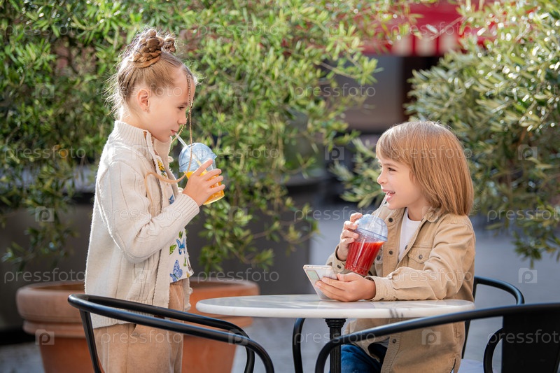 Дети и подростки весело вместе пьют фруктовый коктейль, сидя за столиком в летнем кафе