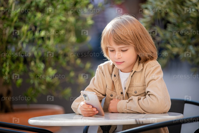 Подросток со смартфоном в руках сидит за столиком в летнем кафе на открытом воздухе
