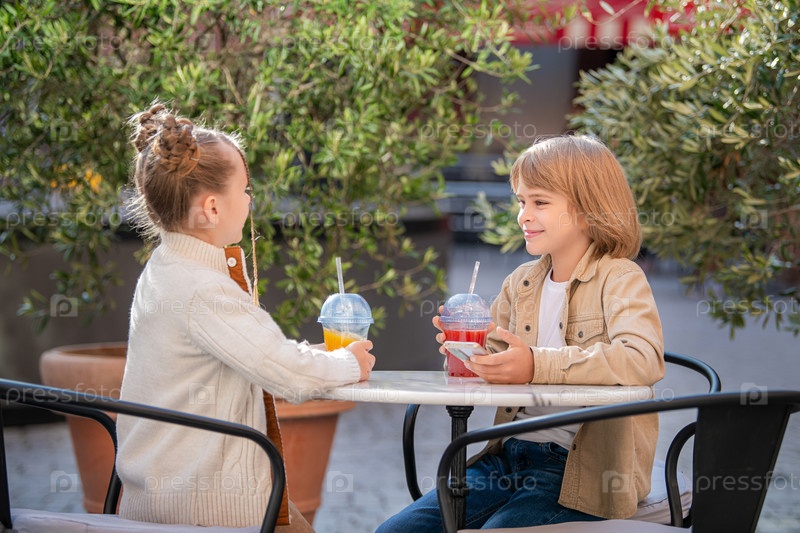 Дети и подростки весело вместе пьют фруктовый коктейль, сидя за столиком в летнем кафе