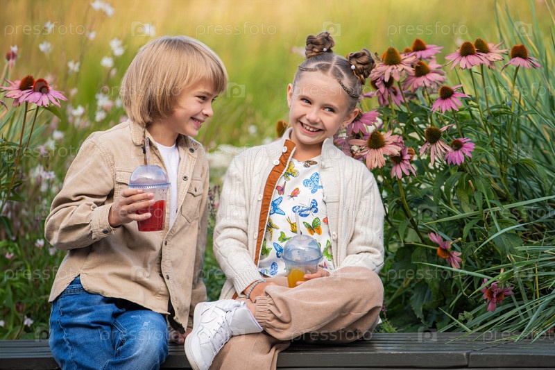 Два счастливых друга играют вместе в летнем парке и пьют фруктовые коктейли
