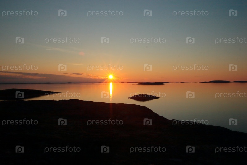 Вид на закате с верхней точки острова Большая Нохкалуда на остров Малая Нохкалуда и острова архипелага Кузова. Вид 2. Белое море. Северная Карелия. Лето 2006 года