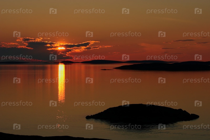 Закатное солнце в облаках. Остров Малая Нохкалуда и острова архипелага Кузова. Вид 1. Белое море. Северная Карелия. Лето 2006 года