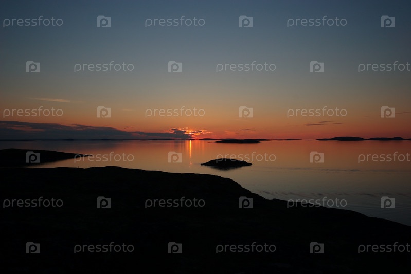 Закатное солнце в облаках. Остров Малая Нохкалуда и острова архипелага Кузова. Вид 2. Белое море. Северная Карелия. Лето 2006 года