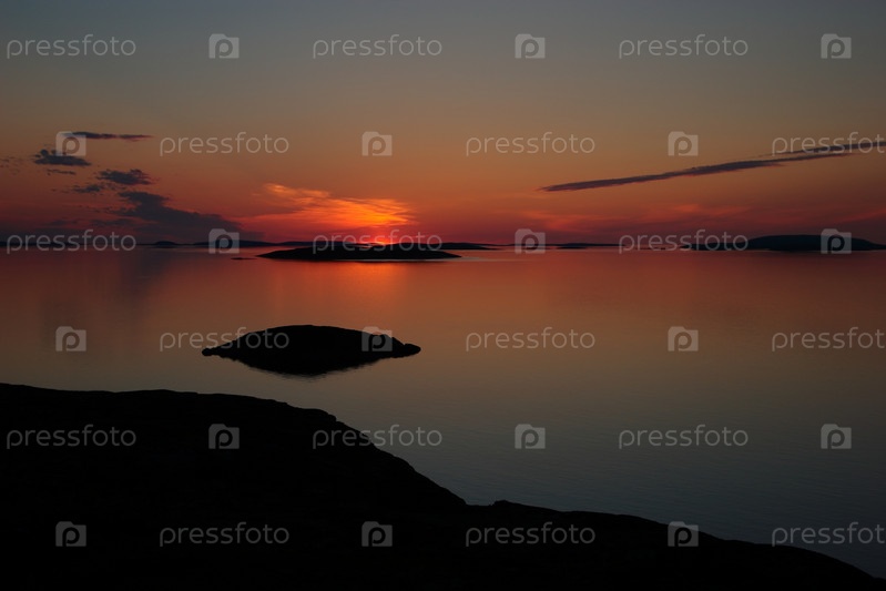 Солнце зашло. Остров Большая и Малая Нохкалуда и острова архипелага Кузова. Вид 2. Белое море. Северная Карелия. Лето 2006 года