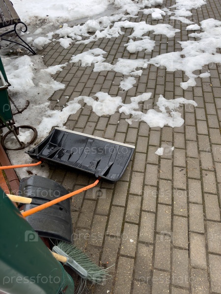 Зимняя лопата стоит возле дома зимой