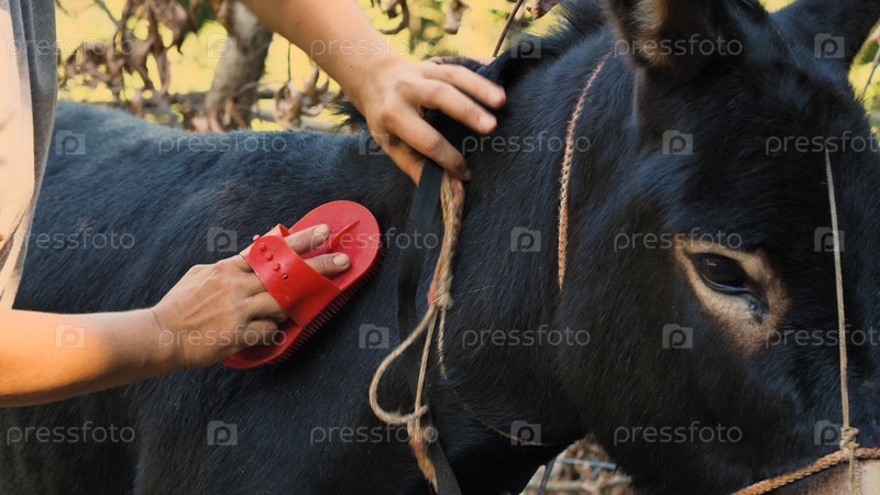На крупном плане запечатлен момент, когда человек расчесывает осла с темной шерстью красной щеткой, что подчеркивает важность заботы и связи на ферме на открытом воздухе