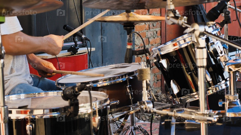 Страстный музыкант погружается в игру на барабанах на живом мероприятии. Яркая атмосфера рок-концерта