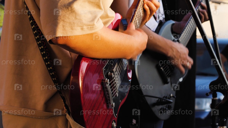 Крупный план мужчины, играющего на гитаре, на заднем плане - другой гитарист. Они вместе выступают на концерте под открытым небом. Акцент делается на взаимодействии музыканта и гитары