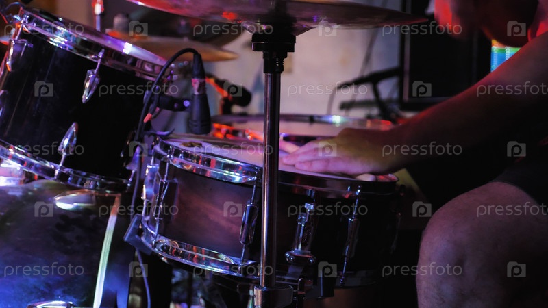 Профессиональная ударная установка, подсвеченная яркими огнями, готова к выступлению. Барабанная установка в центре внимания на сцене