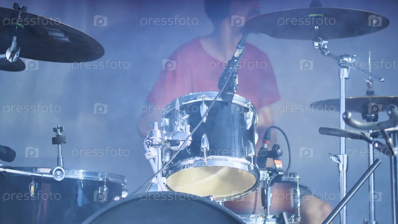 Страстный барабанщик, погруженный в туманную атмосферу, создает мистическое музыкальное переживание. Барабанщик на сцене в белом дыму