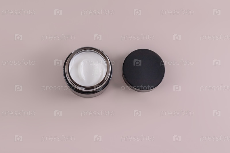 Вид сверху на косметическую открытую темную стеклянную банку с натуральным кремом для ухода за кожей лица и тела. Светлый фон. Копировальное пространство. Нежная текстура продукта