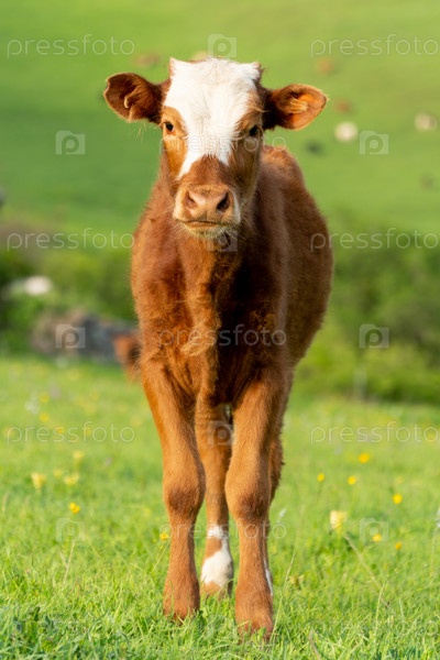 Теленок стоит на цветущем лугу в лучах солнца