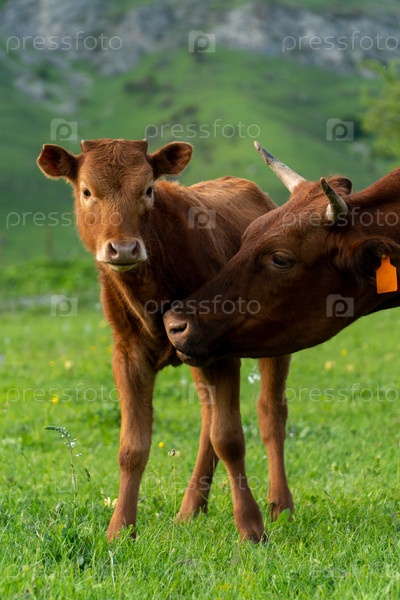 Корова нежно целует теленка на зеленом лугу