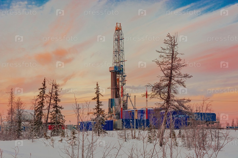 Пейзаж северного ландшафта нефтегазового месторождения с буровой установкой на фоне красивого неба. Зимний полярный день