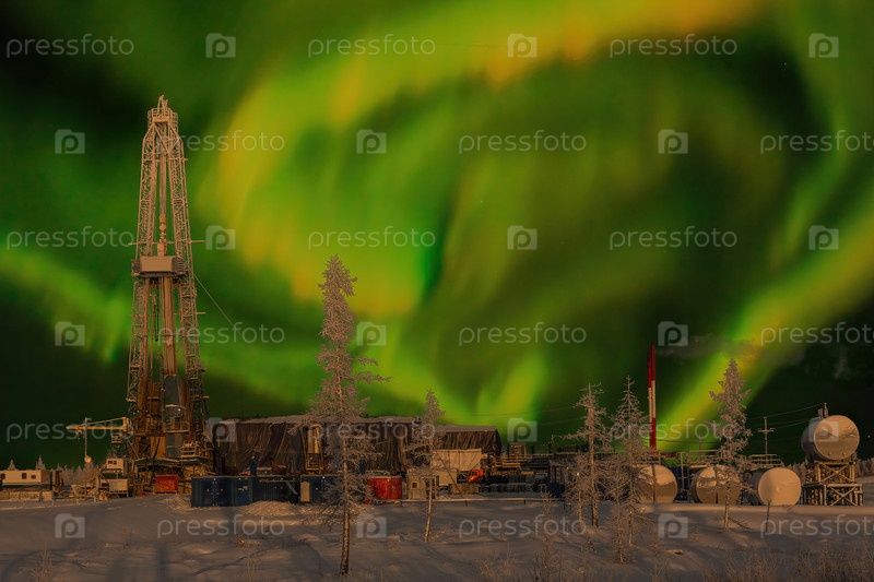 Буровая установка и северный пейзаж нефтегазового месторождения на фоне полярного сияния. Пейзаж с красивым ночным небом зимой в Арктике