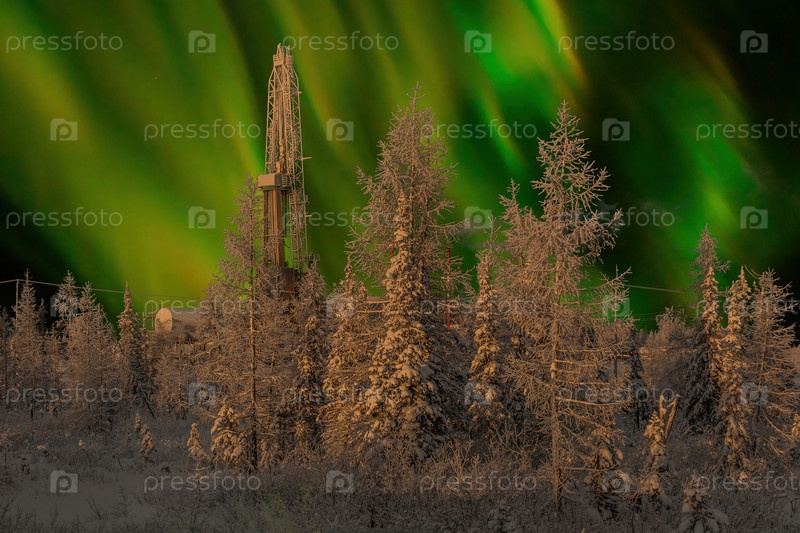 Буровая установка и северный пейзаж нефтегазового месторождения на фоне полярного сияния. Пейзаж с красивым ночным небом зимой в Арктике