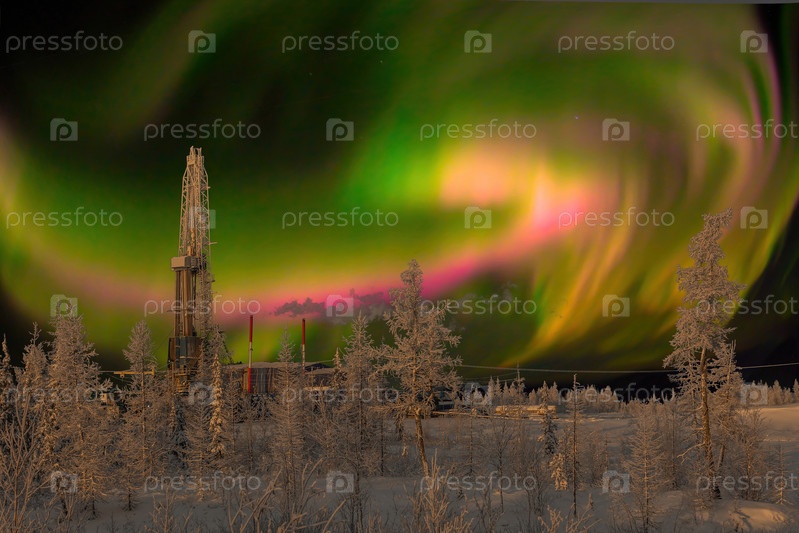 Зимний пейзаж полярной ночью с буровой установкой. Северное нефтегазовое месторождение. На заднем плане красивое небо с северным сиянием
