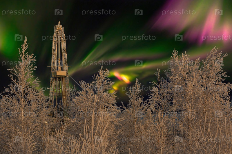 Полярная ночь. Зимний пейзаж с буровой установкой на северном месторождении нефти и газа. На заднем плане красивое небо с северным сиянием