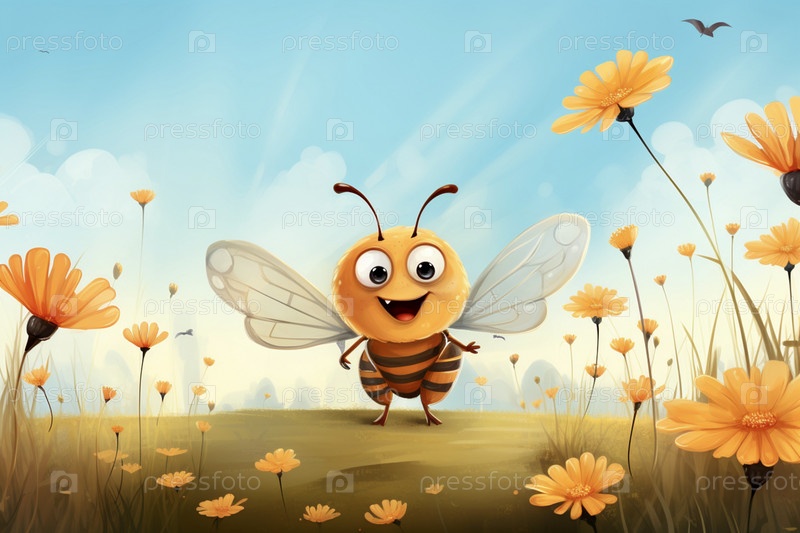 Забавная пчела на лугу с цветами