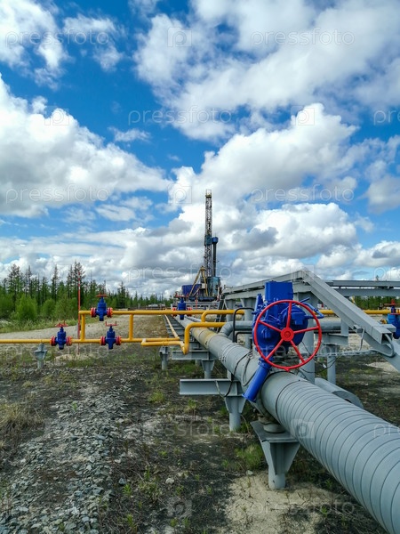 Трубопроводный коллектор газовых скважин добывающих газовых скважин Северного месторождения. Штурвалы задвижек высокого давления, трубопроводы. На заднем плане буровая установка. Размытие удаленных объектов