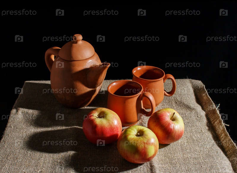 Натюрморт с глиняным чайником, двумя чашками и тремя красными яблоками. Крытый крупный план на черном фоне
