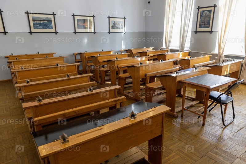 Россия. Ульяновск. Парты в классе в Музее Симбирская классическая гимназия. Россия. Ульяновск. Столы в классе в Simbirsk Classical Gymnasium Museum