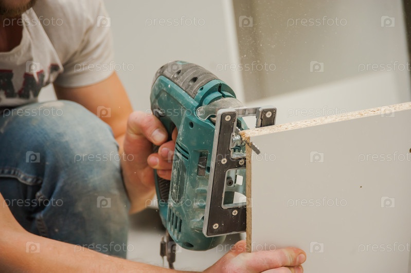 Процесс распиловки плит ДСП лобзиком при сборке мебели