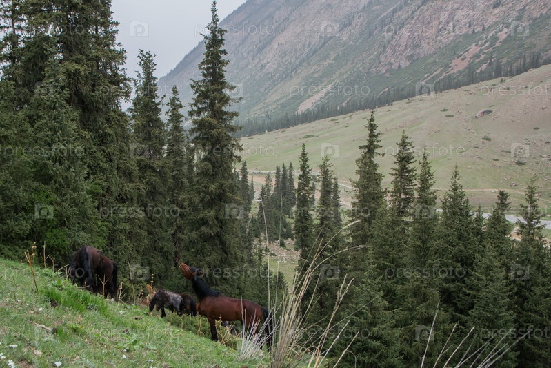 Лошади щиплют траву на горных склонах Кыргызстана в лесу