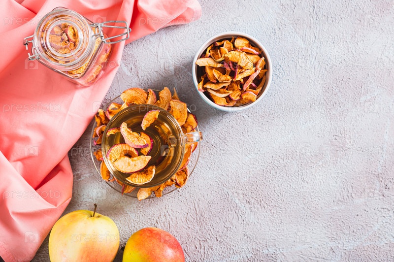 Вкусный компот из ароматных сушеных яблок в чашке на столе, вид сверху веб-баннера