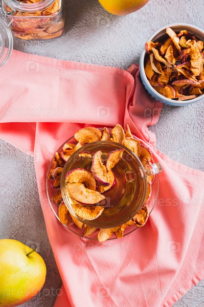 Сладкий компот с сушеными яблоками в кружке на столе и вертикальный вид