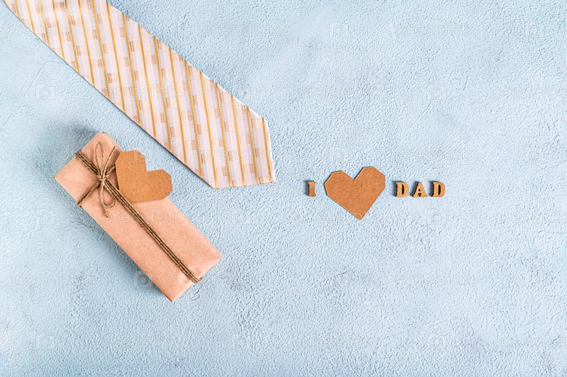 Подарок на день отца, галстук, сердце и надпись на синем фоне