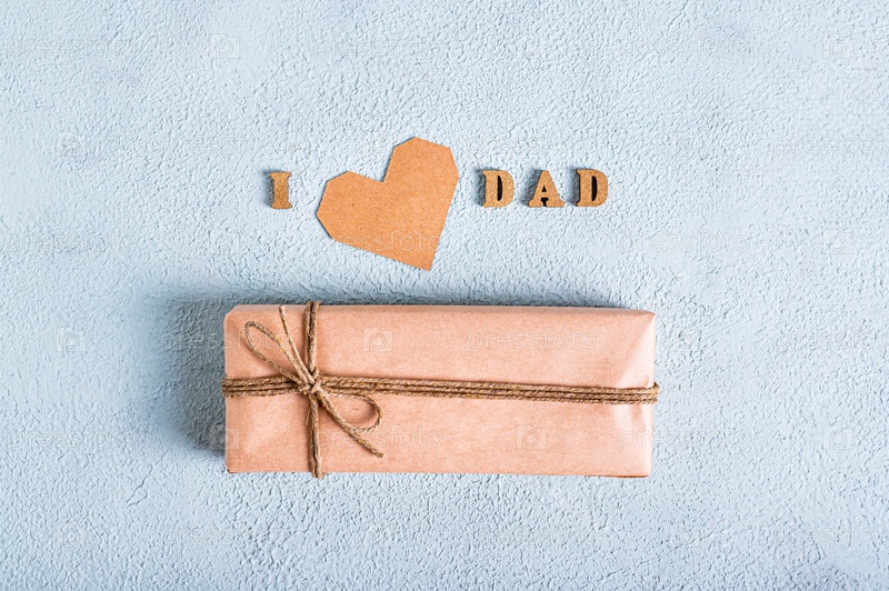 Подарок на день отца, картонное сердце и надпись на синем фоне