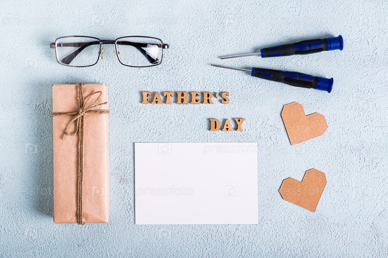 Подарок ко Дню отца, сердца, очки, отвертки, лист бумаги и надпись на синей текстуре