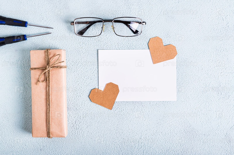 Подарок ко Дню отца, сердца, очки, отвертки и лист бумаги на синем фоне