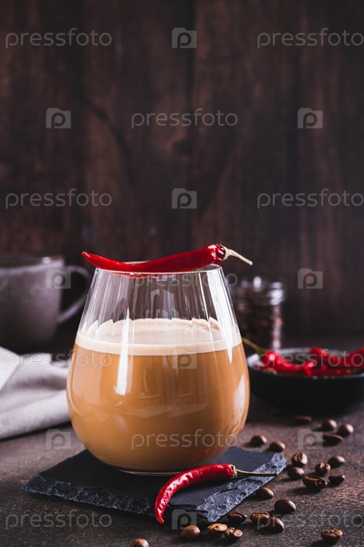 Пряный кофе-латте с перцем чили в стакане на столе, вертикальный вид