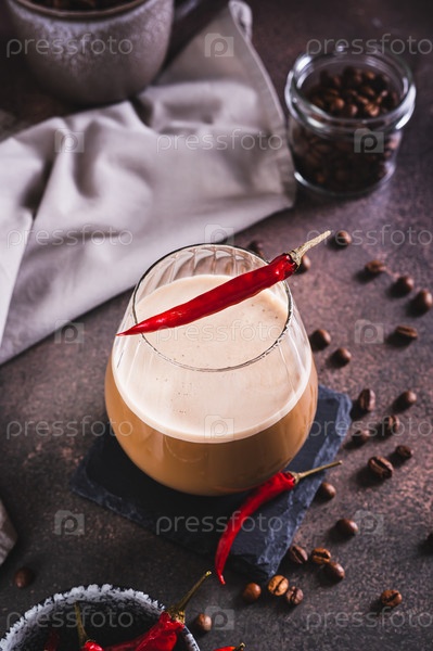 Чашка горячего пряного кофе латте с красным перцем чили на столе, вертикальный вид