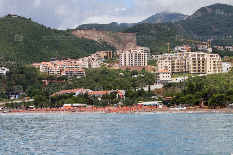 Вид с моря на курортный город Будва, Черногория летом
