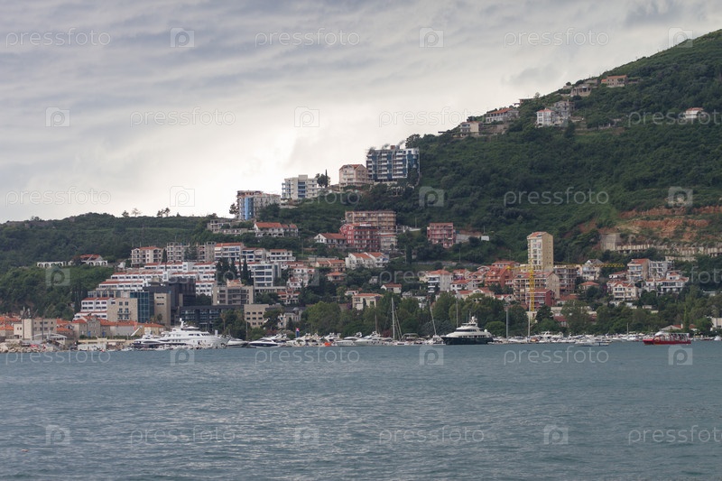 Вид с моря на курортный город Будва, Черногория летом