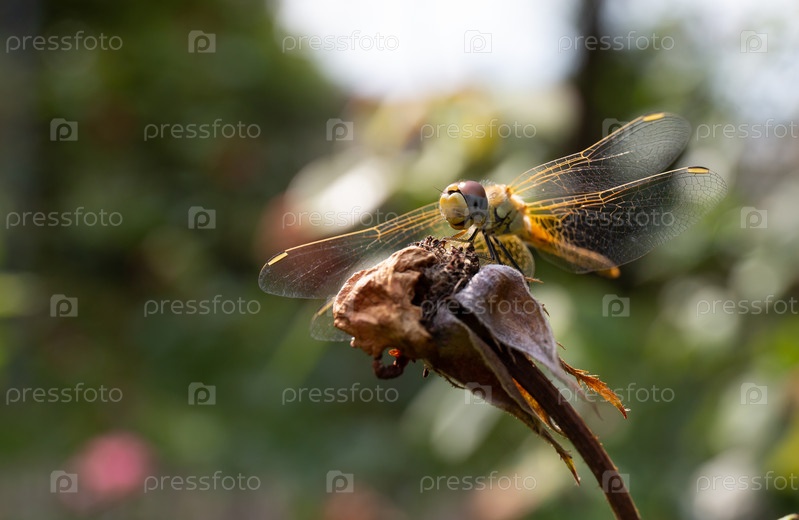 Красивая стрекоза на засушенном цветке в старом парке летом